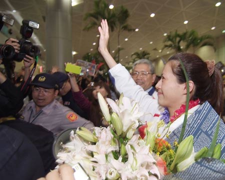 楊淑君22日晚18時50分搭機隨隊返臺。從步出登機門,到入境大廳的過程中,不少旅客高喊楊淑君加油,也有免稅店的店員、入出境旅客頻頻向她比出V字型勝利的手勢。