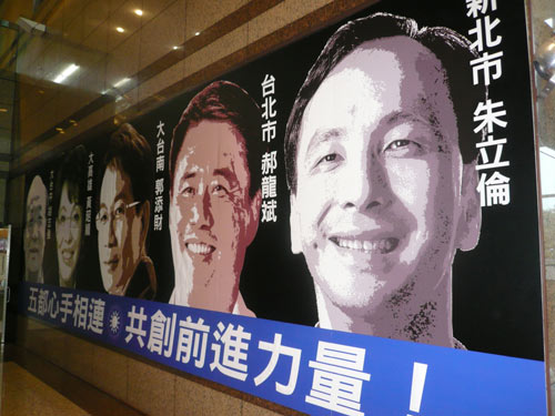 國(guó)民黨當(dāng)初為因應(yīng)“五都”選舉,特別在中央黨部1樓大廳兩側(cè)張貼巨型的“五都”市長(zhǎng)候選人看板,訴求“‘五都’心手相連,共創(chuàng)前進(jìn)力量!笨窗迳希卤笔虚L(zhǎng)候選人朱立倫、臺(tái)北市長(zhǎng)候選人郝龍斌、臺(tái)南市長(zhǎng)候選人郭添財(cái)、高雄市長(zhǎng)候選人黃昭順、臺(tái)中市長(zhǎng)候選人胡志強(qiáng)的照片一一呈現(xiàn)。