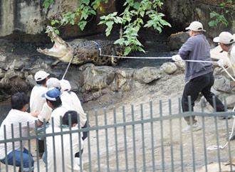 昨天上午九時(shí),動物園保育員如臨大敵,先將特制兩座大長鐵籠,以吊車安置到鱷魚池區(qū)內(nèi);兇猛的咬人公河口鱷靜臥水池,母鱷臥停在池邊角落爛泥區(qū),保育員先丟擲一只肉雞誘食,觀察已七天未喂食的公鱷反應(yīng),公鱷絲毫未理會。