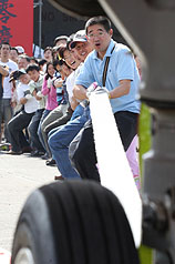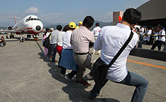 員工組則顯得有備而來,穿著整齊制服,當(dāng)30十名選手還拉不動時,遠(yuǎn)航董事長樂大信和總經(jīng)理陳尚群也加入拔河,直到40人終于拖動飛機(jī),多位選手大呼好玩。