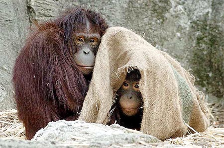 臺(tái)北市動(dòng)物園里的猩猩也冷到受不了,蓋著麻布抵擋寒風(fēng),沒搶到的只好依偎在同伴身旁取暖。(圖:臺(tái)灣《中國時(shí)報(bào)》)