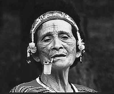 泰雅文化工作者田貴實先生告訴我們,對男子而言,文面是成年的標志,也是勇武的象征;對于女子,則是善于織布的標記。同時,文面還有辟邪、美觀和祖靈識別的作用,經(jīng)過完整文面的泰雅男女生時受到族人的認可、敬重,死后則可順利通過“彩虹橋”,到達祖靈承諾的安息之鄉(xiāng)。但文面的風俗在日據(jù)時代被禁止,如今尚存的文面老人已不多(見圖)。