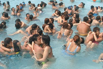 中新網(wǎng)7月30日電 臺(tái)北縣八里鄉(xiāng)八仙水上樂園4年前舉辦“愛的啵!逼呦η槿斯(jié)活動(dòng),吸引百余對(duì)情侶在水中忘情擁吻。今年8月7日“七夕”要挑戰(zhàn)更高難度,舉辦“水底接吻競(jìng)賽”,第一名可獲得水中數(shù)碼相機(jī)1臺(tái)。