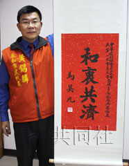 黃錫麟高舉馬英九贈(zèng)給“中華保釣協(xié)會(huì)”的題詞。