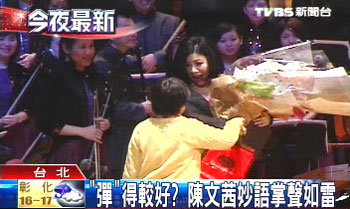 據(jù)臺(tái)灣TVBS報(bào)道,民樂團(tuán)奏出西方《歌劇魅影》里的歌曲,別有一番風(fēng)味,但仔細(xì)瞧,彈鋼琴的不是名嘴陳文茜嗎?再一首《月亮代表我的心》,短短不到十分鐘的表演,搶盡整場(chǎng)鋒頭。