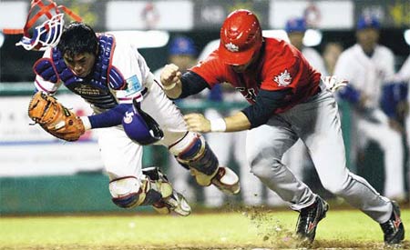 八局上,加拿大隊(duì)的凡歐斯崔德借隊(duì)友安打掩護(hù),想從二壘直沖本壘,中國(guó)臺(tái)北隊(duì)右外野手張建銘長(zhǎng)傳又快又準(zhǔn),捕手葉君璋已等在本壘板前,不料凡歐斯崔德靠著一米九三、一百零二公斤壯碩身材,用兩手肘猛撞,把葉君璋彈開,葉全力護(hù)球,還是觸殺出局。