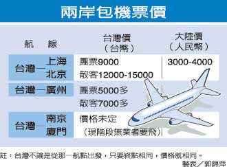 東南旅行社經(jīng)理黃國(guó)軒表示,由于各家航空公司直航包機(jī)的起降時(shí)間還未最后敲定,若排在好時(shí)段,也會(huì)比一般時(shí)段票價(jià)高出五百至八百元。