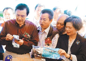 馬英九23日到宜蘭縣參加鯖魚節(jié)活動(dòng),當(dāng)場掏出一迭鈔票,數(shù)了兩萬元買魚松、鹽漬鯖魚等產(chǎn)品,希望民眾也多消費(fèi)。圖片來源:臺(tái)灣《聯(lián)合報(bào)》