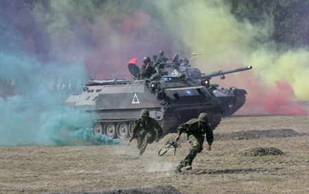 中新網(wǎng)1月24日電 臺灣軍方昨天在高雄舉行裝甲車操演,模擬對手滲透導(dǎo)彈基地的反制演習(xí),共出動兩百多名士兵及數(shù)十輛坦克,場面相當(dāng)逼真。