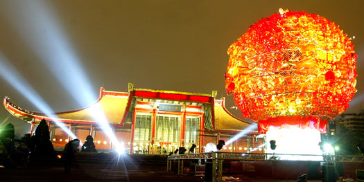 臺北燈節(jié)主燈13日晚在“國父”紀念館進行測試。璀璨的光束將夜晚照得燈火通明,也讓人提前感受到元宵的歡樂氣氛。(圖:臺灣《聯(lián)合報》)
