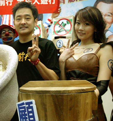國民黨的全民大游行活動訊息現(xiàn)場邀請模特兒展示游行大隊的主題;民進黨的活動上參加活動年輕人在臉上寫“勝”字挺謝長廷。