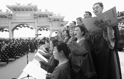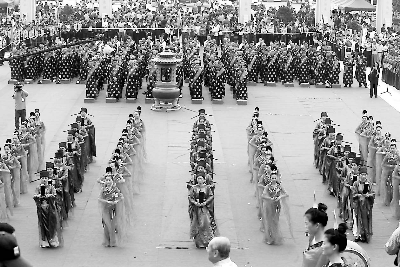 上午9點(diǎn)半,此次活動(dòng)的重頭戲——保生大帝頌典儀式開始。在數(shù)通鳴鐘響鼓之后,兩列身著錦衣、手持斧鉞的古裝衛(wèi)士沿著石階緩緩而下,海滄青礁慈濟(jì)宮理事長(zhǎng)呂根銓、臺(tái)灣保生大帝信仰總會(huì)創(chuàng)會(huì)理事長(zhǎng)廖武治作為主祭人,率領(lǐng)290座各地宮廟代表,在保生大帝神像前開始隆重的頌典儀式。詠?zhàn)x頌文、獻(xiàn)花獻(xiàn)果、贊唱,吸收了祭孔、祭黃帝和祭媽祖的保生頌典儀式,讓現(xiàn)場(chǎng)的兩岸鄉(xiāng)親大飽眼福。頌典儀式上還進(jìn)行了充滿懷古思緒的歌舞表演,身著多彩輕紗的舞者翩翩起舞,幾十人的古裝儀仗隊(duì)整齊排列于兩旁,盡顯盛大莊重的氣氛,也向現(xiàn)場(chǎng)所有來賓展示了中華文化的禮儀和鮮活的民俗文化。