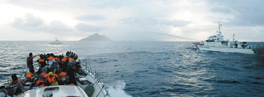 “全家!本噌烎~(yú)島還有40海里時(shí)(約74公里),日本巡邏艦以跑馬燈警告,要求“全家!备淖兒较。4時(shí)53分,載著保釣人士的“全家!保伞昂Q彩稹迸炌ёo(hù)衛(wèi)進(jìn)入釣魚(yú)島12海里處,臺(tái)日船艦劍拔弩張。
