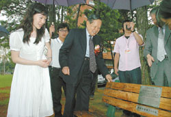 演講結(jié)束,翁帆慢步走上講臺(tái),大方地與與楊振寧站在一起,與簇?fù)淼膶W(xué)生合照,然后一起開(kāi)心地手牽手前去為諾貝爾大師椅揭幕。這時(shí)天空飄起細(xì)雨,“小心啊,地滑!”翁帆提醒楊振寧,兩人臉上帶著笑意,也卸除了大學(xué)師生對(duì)“大師”兩個(gè)字的恐懼。