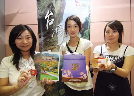 大陸觀光首發(fā)團(tuán)四日抵臺,桃園縣也前往桃園機(jī)場宣傳桃園之美,其中包括宣傳大溪豆干、龍?zhí)敦曁、慈湖觀光導(dǎo)覽!爸醒肷纭眻D