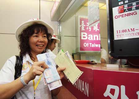 大陸觀光首發(fā)團(tuán)四日來臺,廣東旅客拿人民幣兌換新臺幣時,心情相當(dāng)興奮!爸醒肷纭眻D
