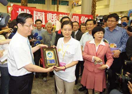 兩岸周末包機(jī)啟動(dòng),大陸居民赴臺(tái)觀光首發(fā)團(tuán)四日抵臺(tái),搭乘南方航空的香港城市大學(xué)的博士研究生陳婷婷(左二),經(jīng)過計(jì)算機(jī)選號(hào),成為首發(fā)團(tuán)來臺(tái)第一人。 “中央社”圖
