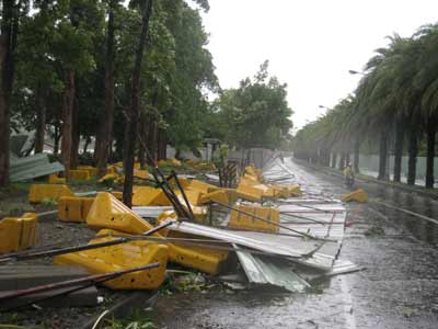 高雄市客家文化園區(qū)新建工程不堪強風吹襲,鐵皮圍籬一路倒塌,嚴重影響車道的暢通。