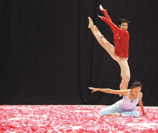 農(nóng)歷大年初五一場(chǎng)大火,燒掉云門舞集的家,浴火后云門再度出發(fā),昨天在數(shù)萬片花瓣圍繞下舞新作“花語”。藝術(shù)總監(jiān)林懷民說,人生有不同風(fēng)景,不見得都是美麗的,“花語”不只有漂亮的花瓣,還有不斷擾人的風(fēng)扇聲,吹動(dòng)著花瓣隨處飄飛,這風(fēng)是人生的風(fēng),不知不覺吹白了頭。(臺(tái)灣《聯(lián)合報(bào)》圖)