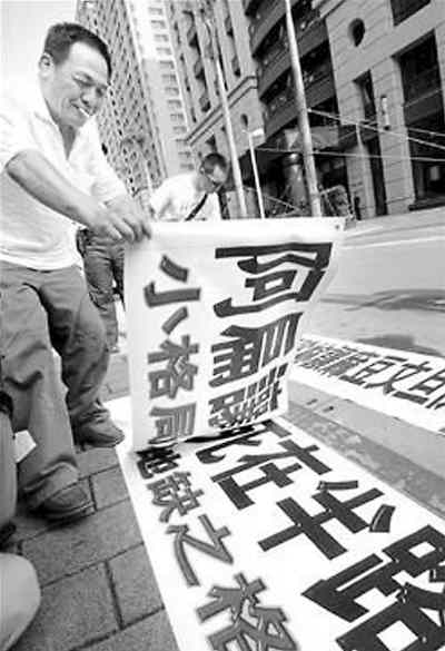 自稱(chēng)吳淑珍老鄉(xiāng)的施新登(前),在陳水扁家樓下擺放橫幅表示抗議。