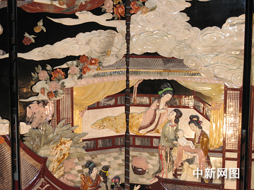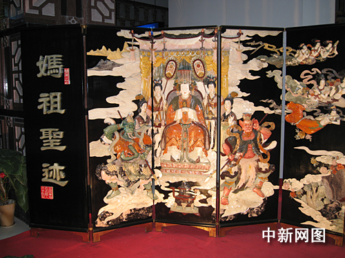 中新網(wǎng)10月25日電 圖為位于中國閩臺緣博物館內(nèi)的巨幅玉石鑲嵌《媽祖》。作品高2米,長30米,歷時5年,采用天然玉、石、珍珠、瑪瑙、翡翠、鉆石鑲嵌。該畫根據(jù)《敕封天后志》、《天后顯圣錄》以及民間有關(guān)媽祖?zhèn)髡f繪成,以連續(xù)不斷的立體與浮雕畫面展現(xiàn)了媽祖救海難、護(hù)使節(jié)、解旱治病的圣跡。