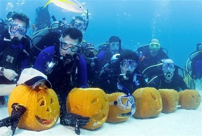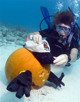 與此同時(shí),美國佛羅里達(dá)州26日在海底舉辦了一場別開生面的南瓜雕刻大賽,吸引很多人參加,營造節(jié)日氣氛。