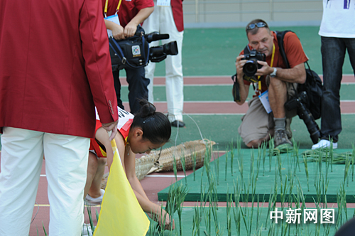 中新網(wǎng)泉州10月28日電 (劉通)今天上午,第六屆全國農(nóng)民運(yùn)動會田徑項(xiàng)目在福建泉州海峽體育中心開賽。圖為專注采訪農(nóng)運(yùn)60米插秧比賽的兩名外國記者。