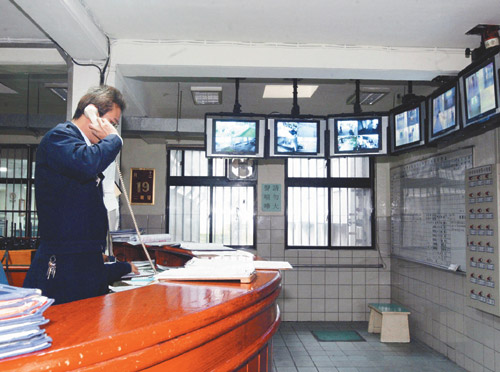 每個(gè)舍房門口都有管理員坐鎮(zhèn),從監(jiān)視器看陳水扁的一舉一動(dòng)。另可從監(jiān)窗口查看,中央臺(tái)也有器作第二線監(jiān)事。圖片來源:臺(tái)灣《聯(lián)合報(bào)》