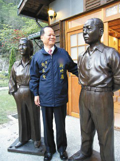 新竹縣長(zhǎng)鄭永金望著少帥銅像,內(nèi)心無(wú)限感動(dòng),一旁為趙一荻銅像
