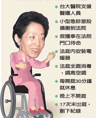 臺(tái)北地院這次更破天荒開(kāi)庭30分鐘就讓吳淑珍休息一次,也就是開(kāi)庭的第七法庭對(duì)面的第八法庭,將成為吳淑珍專屬醫(yī)療間,還擔(dān)心吳淑珍怕冷,出庭座位下還會(huì)放置暖爐。