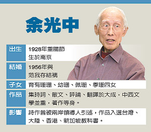 范我存說,余光中全身行頭都是家人幫忙買,只一項無法代勞,“就是鞋子。”因為鞋子非得自己試,才知合不合腳。