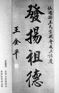 在日前舉行的仙游縣王氏文化研究會(huì)成立大會(huì)期間,仙游的王氏宗親們收到了來(lái)自臺(tái)灣王氏宗親王金平為王氏宗親會(huì)成立發(fā)來(lái)的賀呈。王金平的題詞是:發(fā)揚(yáng)祖德。(如圖)