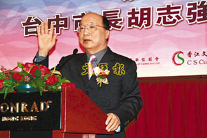 中新網(wǎng)12月19日電 臺(tái)中市長(zhǎng)胡志強(qiáng)18日在香港香江文化交流基金會(huì)午餐會(huì)發(fā)表演講,提出加強(qiáng)臺(tái)中、香港、廈門的經(jīng)濟(jì)文化交流,建設(shè)南峽(臺(tái)灣海峽南部)金三角經(jīng)濟(jì)區(qū)。