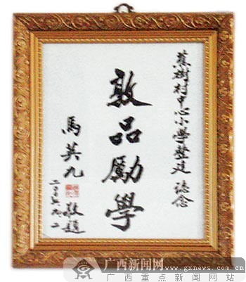 此后,謝先生先后5次將籌集的款項轉到謝桂林所提供的賬戶,共200多萬臺幣,折合人民幣75萬多元。2007年2月,謝先生轉給謝桂林一筆錢,并特別告訴他其中有5萬元臺幣是馬英九先生個人捐款。為此,該校在那年春節(jié)期間,還特別掛出橫幅“衷心感謝中國國民黨主席馬英九先生為我校建校捐款新臺幣5萬元”。昨日謝校長指著他辦公室掛的一幅字向記者介紹,2007年8月,謝先生特意請馬英九先生為該小學題字作為紀念,并以掛號信的方式寄過來。記者看到,上面寫著“敦品勵學”,左邊落款是“馬英九敬題 二00七年九月二日”。