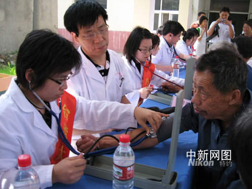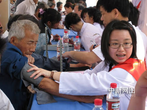 今日在六合區(qū)雄州市街道敬老院,長條課桌鋪開一溜,二十多個臺灣大學(xué)生著清一色白大褂,神情嚴肅認真、儼然“大夫”模樣。在敬老院七十五個老人面前,他們詢病問傷,量血壓、針灸、開藥方,忙得不亦樂乎。
