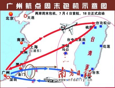 記者從國家民航局獲悉,后日首次周末包機(jī)共有18班包機(jī)往返兩岸,大陸航空公司分別由北京、上海(浦東)、廣州、廈門和南京5個首批開放航點往返臺北桃園和松山兩個機(jī)場,臺灣公司則由臺北、臺中、高雄、花蓮、澎湖5城市飛往北京、上海、廣州、廈門。