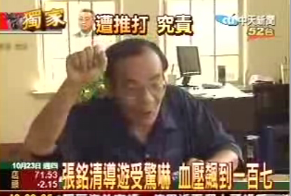 海協(xié)會(huì)副會(huì)長張銘清在臺(tái)遭襲事件,不但令國際震驚,就連臺(tái)南人自己也被嚇了一大跳。據(jù)臺(tái)灣中時(shí)電子報(bào)23日消息稱,當(dāng)天擔(dān)任張銘清在孔廟的導(dǎo)游的江文章,說自己當(dāng)時(shí)被嚇得腦袋一片空白,后來量血壓,竟然發(fā)現(xiàn)血壓飆高到170。