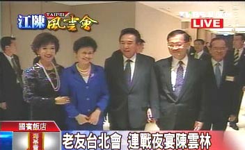 中新網(wǎng)11月4日電 據(jù)臺灣“今日新聞”報道,海協(xié)會會長陳云林4日晚上應(yīng)國民黨榮譽主席連戰(zhàn)伉儷之邀,與夫人賴曉華赴臺北國賓飯店與政界、企業(yè)界共享晚餐,連戰(zhàn)、陳云林在享用餐點前也先后致詞。