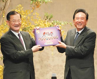 國(guó)民黨榮譽(yù)主席連戰(zhàn)(左)4日以晚宴款待海協(xié)會(huì)會(huì)長(zhǎng)陳云林(右),并致贈(zèng)臺(tái)灣名產(chǎn)“鐵蛋”。(圖:臺(tái)灣《聯(lián)合報(bào)》)