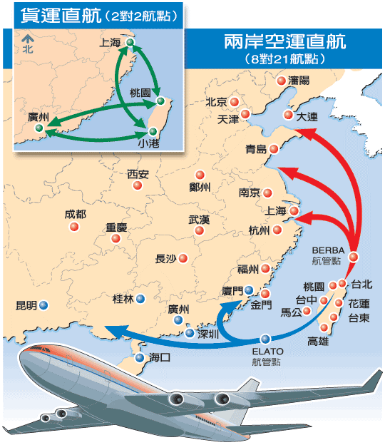 在四項協(xié)議中,最受人矚目的《兩岸空運(yùn)協(xié)議》提到,雙方同意開通臺灣海峽北線空中雙向直達(dá)航路,建立兩岸航(空)管部門的直接交接程序。雙方同意繼續(xù)磋商開通臺灣海峽南線空中雙向直達(dá)航路及其它更便捷的航路。
