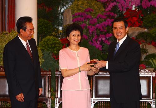 馬英九贈送給陳云林的是一個造型像達悟族獨木舟、上面畫著臺灣蝴蝶蘭,象征一帆風順的鶯歌陶作(位于臺北縣的鶯歌鎮(zhèn)以“陶瓷”著稱,有“臺灣景德鎮(zhèn)”美譽。);贈送給陳云林夫人賴曉華的是一件琉璃工坊的“大愛豐收”琉璃作品。