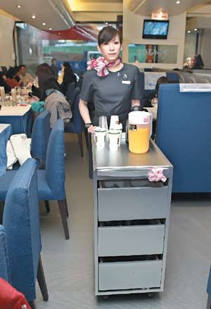 該餐廳的餐點(diǎn)除了推出真正的飛機(jī)餐外,另配合八種航線推出八國(guó)異國(guó)套餐。呂寶珍指出,為了進(jìn)一步展現(xiàn)機(jī)上情境,已著手規(guī)劃頭等艙專區(qū),未來(lái)將比照機(jī)上賣免稅品方式,由服務(wù)員推小推車促銷香水、吊飾等機(jī)上流行商品。