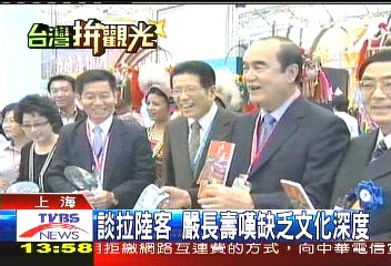 臺(tái)灣觀光協(xié)會(huì)要嚴(yán)長壽帶領(lǐng)金門連江宜蘭花蓮到上海,營銷臺(tái)灣旅游,面對(duì)先前北京喊出百萬人游臺(tái),嚴(yán)長壽感嘆,光喊拉大陸客的口號(hào)不夠,臺(tái)灣拼觀光還是缺乏文化深度。