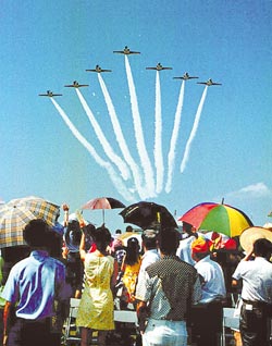 空軍雷虎小組也是遠東地區(qū)第一支特技飛行小組,成立初期就以精湛技術(shù)揚名國際。1957年,在菲律賓航空周首開先例九機編隊表演;1959年赴美參加第一屆航空表演,以九架軍刀機做低空表演贏得贊譽。