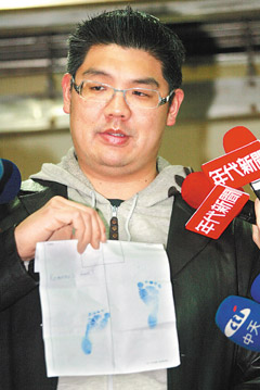 連勝文晚上九點向媒體展示寶貝兒子的腳丫印,他說,看到孩子出世的那一刻,雖然沒有掉淚,但還是相當(dāng)感動,看到孩子的第一眼,覺得孩子長得比較像媽媽,臉型俊秀;體型方面,從腳丫子判斷應(yīng)該是像爸爸,未來應(yīng)該也會相當(dāng)魁梧。