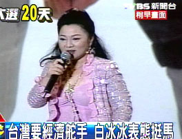 報道說,在這場晚會中,藝人白冰冰表態(tài)挺馬,特地做了一首歌,表示要投給馬英九。藝人白冰冰:“我們一定要選一個,讓我們經(jīng)濟能夠起飛的總舵手,我們大家心連心,手牽手,一起來投給馬英九,讓我們經(jīng)濟,贏過吃威而鋼加配補藥酒,大家說這樣好不好!”
