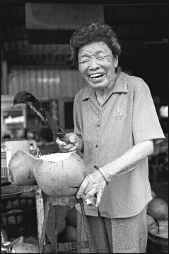 最健康的小桃阿嬤,至今仍在果菜市場靠賣椰子汁維生。當(dāng)聽到工作人員問現(xiàn)場劈二十個會不會吃力?她非常不以為然地說:“我劈一百個都沒問題!”