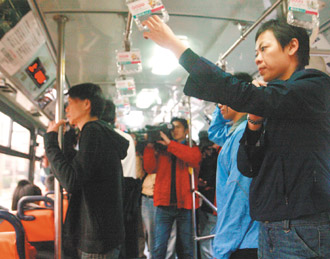 不過,馬英九勝選后,這兩天多了三位隨扈相陪,還有越來越多的媒體記者“包抄”、拍攝坐公交車過程。從出家門開始,周美青雖然表情平和,還不斷提醒大家小心,但偶爾看到攝影記者倒著走快撞到電線桿,仍會(huì)提醒:“這樣很危險(xiǎn)。”
