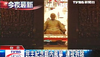 據(jù)臺灣《聯(lián)合報》報道,昨夜三百多只風(fēng)箏、蘭嶼拼板舟拆除后,人們可無礙地看到蔣介石銅像,銅像頭頂重重疊疊的藻井也顯露出來。