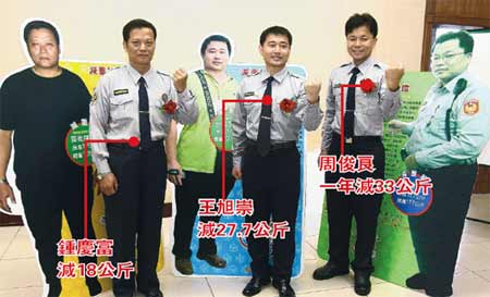 專業(yè)警察單位第1名的鐵路警察局警員鐘慶富利用飲食控制跟慢跑快走,3個(gè)月內(nèi)成功減下18公斤。女警方面,花蓮縣警察局督察室督察員連錦秀05年產(chǎn)后胖了30公斤,利用中午游泳及騎自行車,成功減下30公斤,都是減重成功的最佳范例。